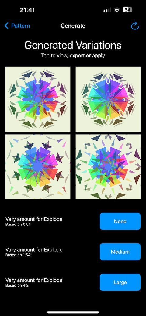 Once we have a pattern we can ask the App to generate variations, by adjusting rules. If we like something we can use it as the basis for more changes.